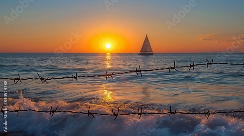 Barbed wire gleaming in the sunset, serene ocean horizon with gentle waves and a sailboat in the distance