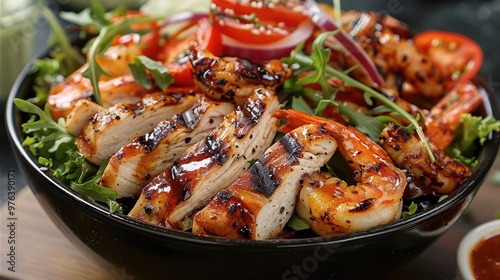 Barbeque Salad with fresh greens, grilled chicken sliced, grilled juicy shrimps, herbs, salad dressing, mayo, grated cheese and other seasonings. Generative AI.