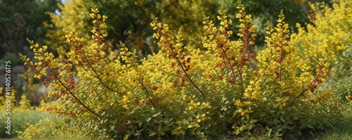 Barberry shrub in a garden with bright yellow flowers, nature, sunny day, yellow flowers