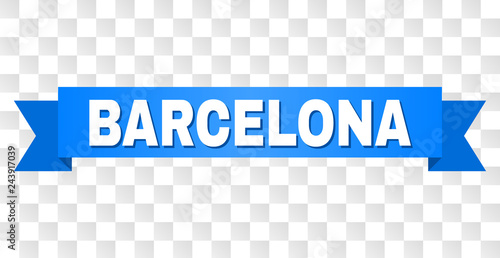 BARCELONA text on a ribbon. Designed with white caption and blue tape. Vector banner with BARCELONA tag on a transparent background.