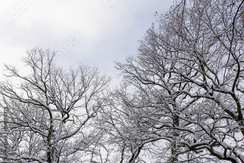 Bare tree branches covered with snow against cloudy winter sky. Natural seasonal background