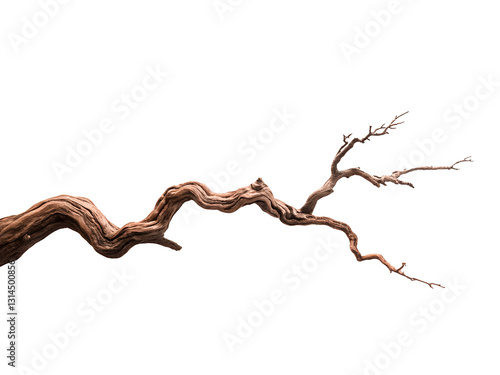 Bare, twisted tree branch isolated on white or transparent png, showcasing detailed texture and distinctive wood design.