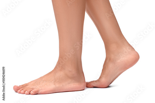 Barefoot woman on white background, closeup view