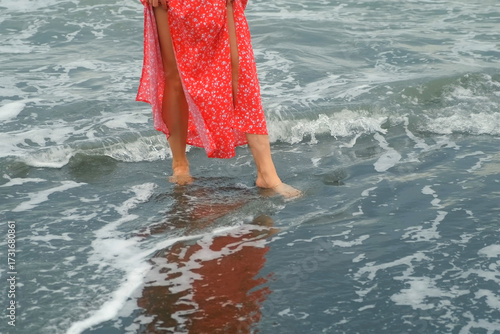 Barefooted young woman wearing red dress walks on wet black volcanic sand enjoying feeling of waves washing over her feet. Tourism travel vacation journey. Girl enjoying sea water relaxing on coast.