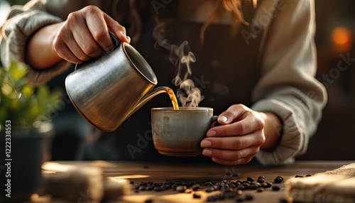 Barista pouring steaming coffee into cup on wooden table with coffee beans