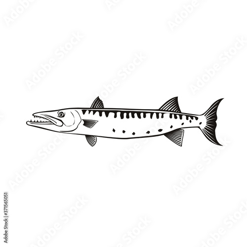 Barracuda or Sphyraena Barracuda Swimming Side Retro Black and White