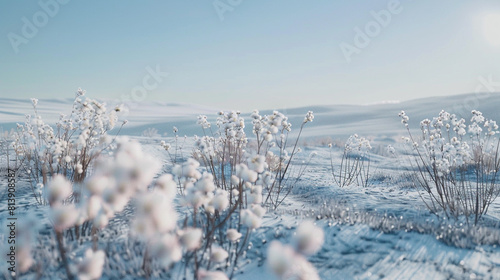 barren winter landscape dotted with white blooms