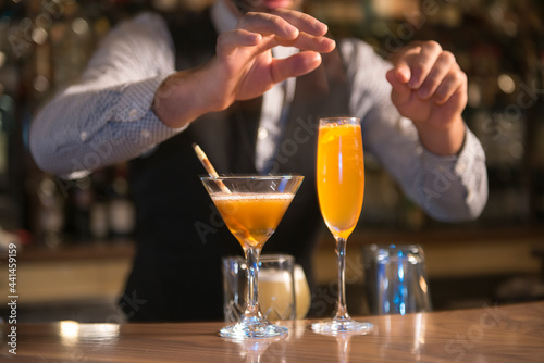 Bartender stirring, squeezing lemon/lime and preparing cocktails and alcoholic beverages in Vancouver restaurant