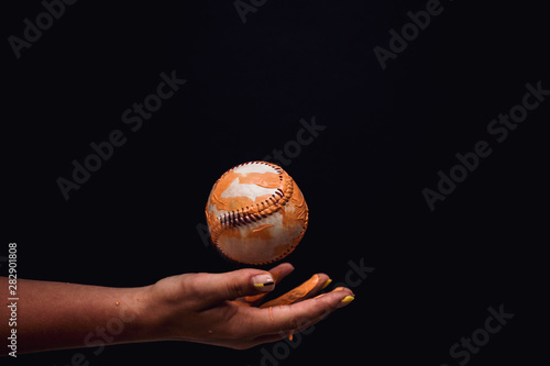 Baseball ball splased with orange painting thrown by hand in the air, isolated on black background