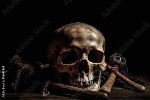 baseball bat resting next to a human skull on a table in a dark room. Generative AI
