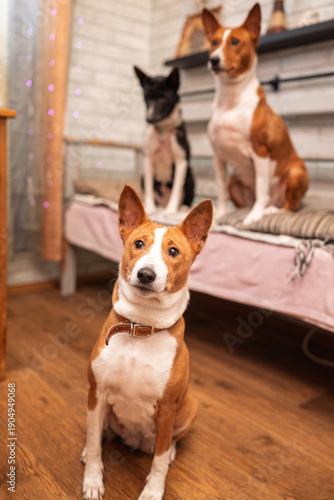 Basenji dogs sitting inside a cozy room