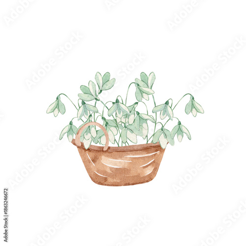 Basket with watercolor snowdrops inside in front side view isolated on png