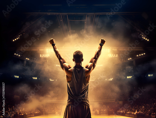 Basketball player celebrating in the stadium. Concept of winner, success, victory. AI generated