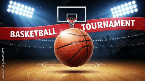 Basketball tournament banner with hoop and court lights image