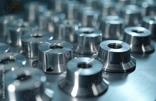 Batch of shiny metal cnc aerospace parts. Precision machined components stacked neatly. Industrial background features high tech manufacturing process.