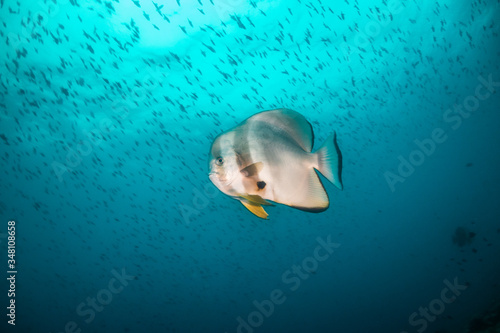Batfish swimming in clear blue water surrounded by small fish