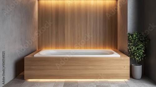 Bath spa with wood panels, stone floor, subtle lighting