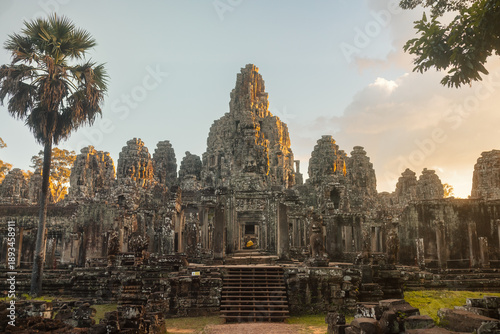 Bayon Temple in Angkor Thom Glowing in Warm Sunset Light, Cambodia Ruins
