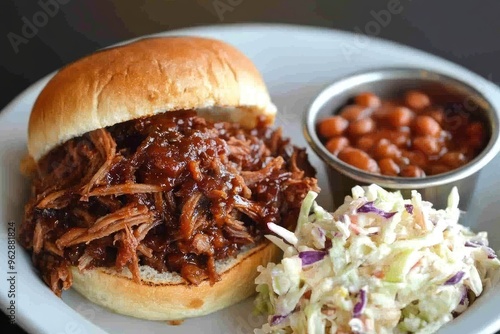 BBQ pulled pork served on a toasted bun with coleslaw and a side of baked beans