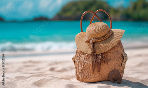 Beach bag. Opened beach bag with sunglasses, hat, bikini, sunscreen and starfish on a sandy shore background. Place for text. Copy space