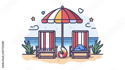 Beach chairs under umbrella, relaxing scene, ocean view, illustration, for vacation print or website