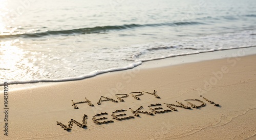 Beach Scene with "Happy Weekend" Written in the Sand at Sunrise, Ocean Waves and Relaxation Concept