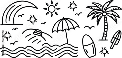 Beach scene with palm tree sun waves surfboard and umbrella ocean