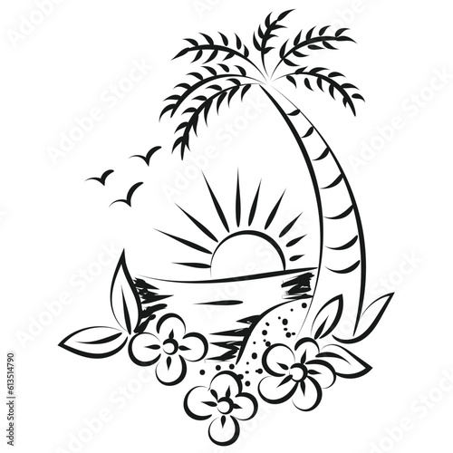Beach scenery line illustration. Palm tree line drawing for print or use as poster, card, flyer or T Shirt