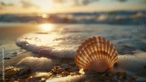 Beach seashell with foam and golden light