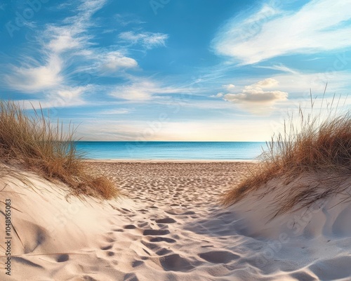 Beach solitude, vibrant colors, serene environment, wide shot, inviting