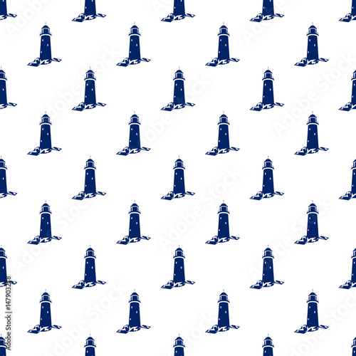 Beacon, Seamless Maritime Pattern, Blue Lighthouse on White Background , Vector Illustration
