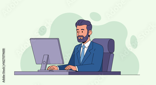 Bearded businessman in a suit focused on his computer at an office desk. Represents professionalism, productivity, and modern business work.