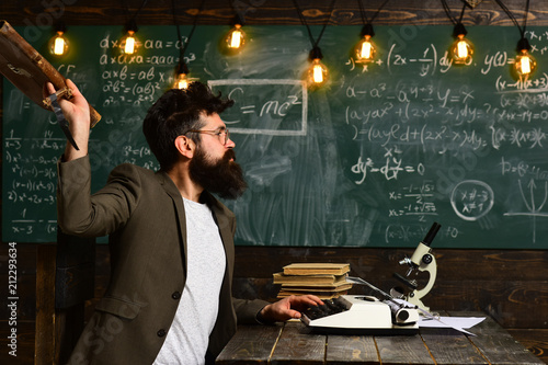 Bearded man throw briefcase. Man with beard typewrite research paper. Businessman in suit work at desk. Scientist in glasses with microscope and books. Future concept. innovation and archaism