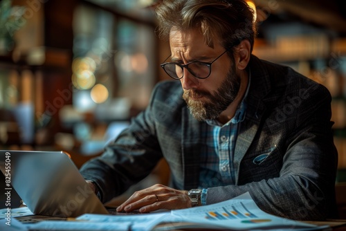 Bearded man with glasses working on a laptop in a cozy office with charts and documents