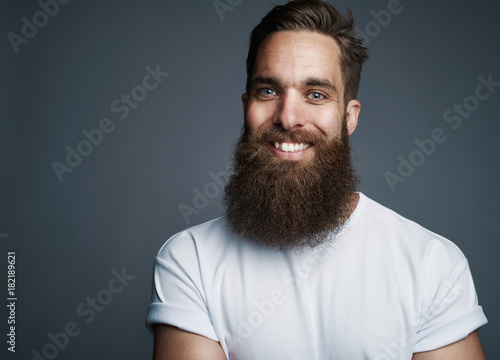 Bearded young man smiling against a gray background
