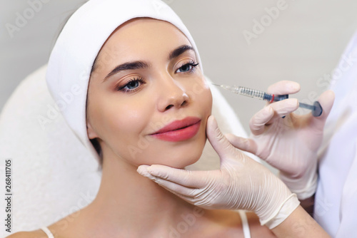 Beautician doctor cosmetologist at work. Biorevitalization cosmetology injection. Face skin treatment hyaluronic acid. Beauty facial filling. Filler. Botox procedure. Healthcare beauty concept