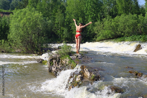 Beautiful adult slender woman in a red swimsuit is bathing in a small waterfall.