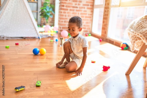 Beautiful african american toddler playing with cars around lots of toys at kindergarten