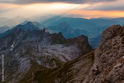 Beautiful alpine summer sunset at the famous Saentis summit, Schwaegalp, Appenzell, Alpstein, Switzerland