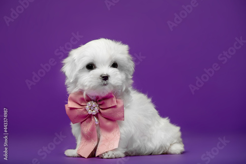 Beautiful and cute maltese puppies on a purple background