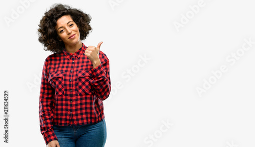 Beautiful arab woman smiling broadly showing thumbs up gesture to camera, expression of like and approval
