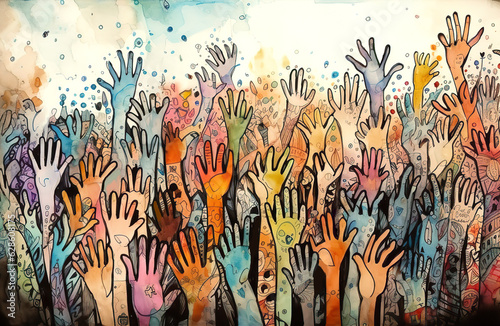 Beautiful artistic background with many humans hands raise up. Togetherness, happiness, celebrations idea