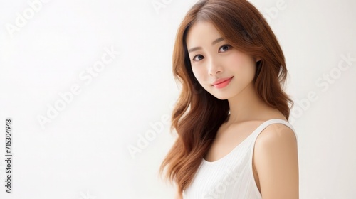 Beautiful Asian Chinese Woman Portrait Studio Photo Photography Profile Picture Young Model with Long Hair for Fashion Beauty Skincare Haircare Products on White Light Color Background 16:9