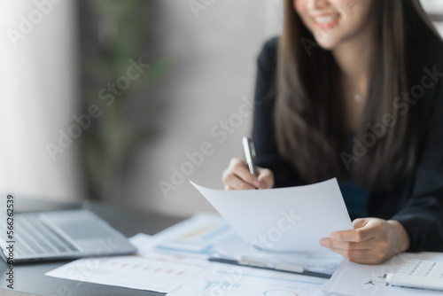 Beautiful Asian female bookkeeper doing online accounting with laptop in private accounting office, balance sheet and stock market statistics.