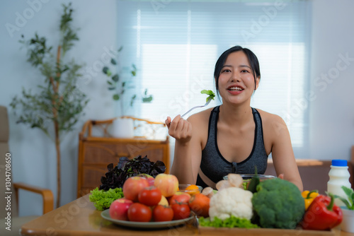 Beautiful asian sportswoman eating a portion of fresh salad in her modern and bright apartment, enjoying a healthy lifestyle and taking care of her body