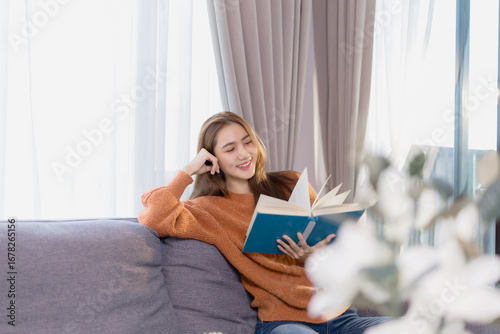 Beautiful Asian woman relaxing on a sofa reading a book in the living room at home, enjoying a quiet and peaceful moment of leisure and self-care