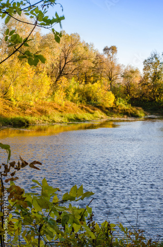 Beautiful autumn landscape. lake and yellow-orange foliage trees. fall season. atmosphere autumnal nature image