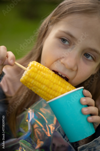 Beautiful blue-eyed girl eating boiled corn in the park.
