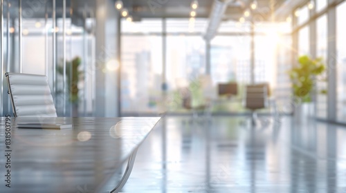 Beautiful blurred background of a light modern office interior with panoramic windows and beautiful lighting.