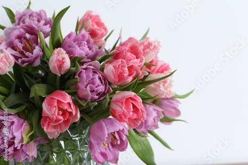 Beautiful bouquet of colorful tulip flowers on white background, closeup. Space for text